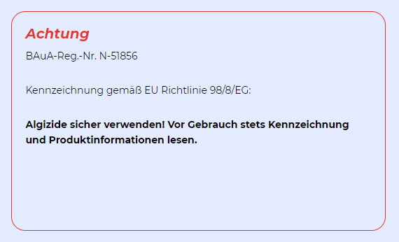 Achtung: Biozide sicher verwenden! Vor Gebrauch sorgfältig die Produktinformation Lesen. Nicht überdosieren! Verträglich für Mikroorganismen, Fische und Wasserpflanzen.