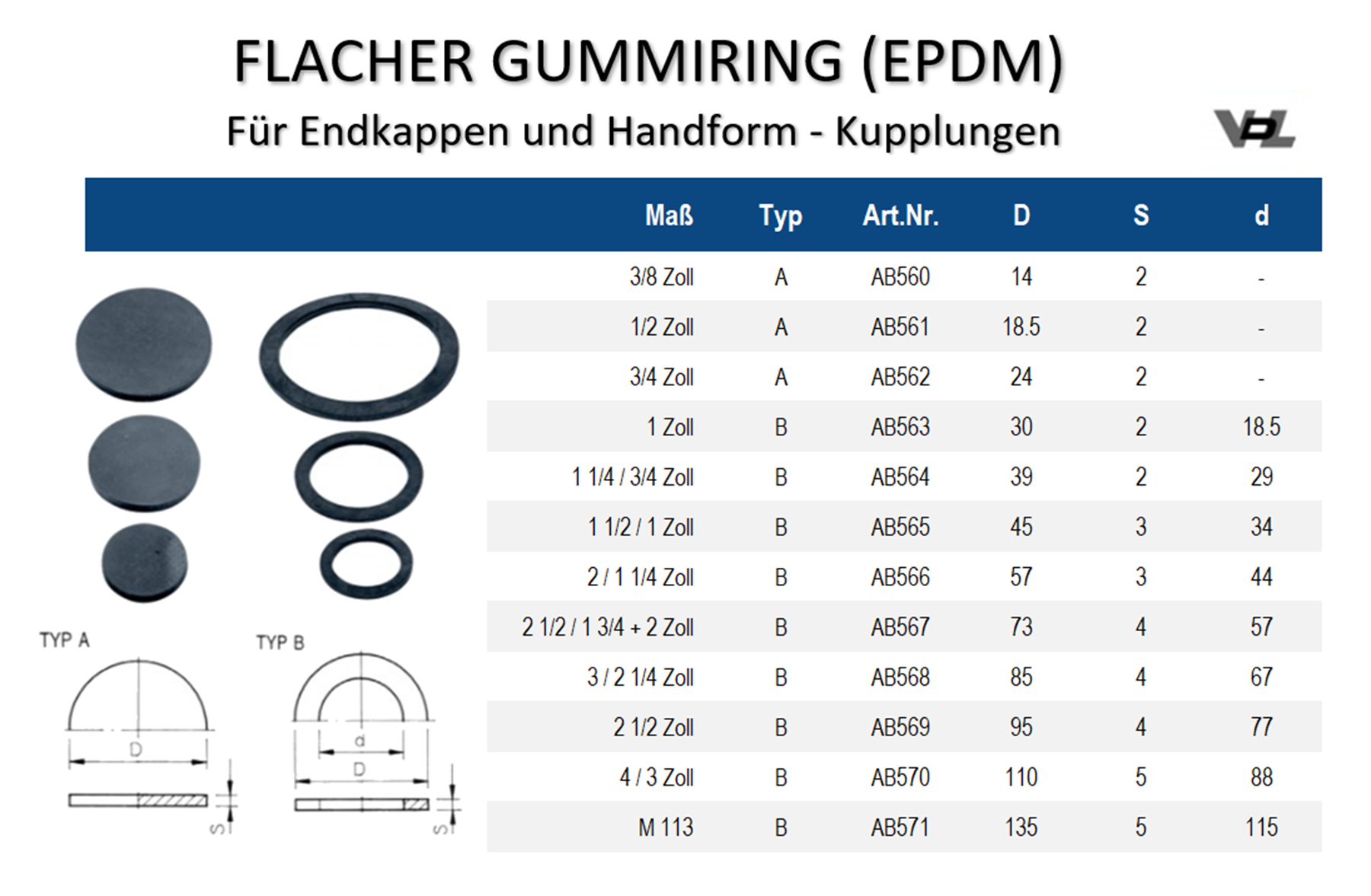 Flacher Gummiring (EPDM) für Endkappen und Handform - Kupplungen (von VDL)