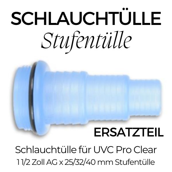 Unsere PVC-Schlauchtülle ist nicht nur langlebig und stabil, sondern auch einfach zu installieren. Sie erhalten ein Ersatzteil, das perfekt passt und schnell geliefert wird. Egal, ob Sie es für das UVC Pro Clear oder andere Installationen verwenden, die hohe Qualität und passgenaue Fertigung unserer Produkte stellen die optimale Funktion sicher.